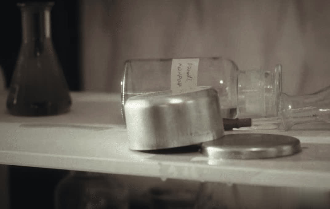 他看到了现场有很多做化学实验的工具和一张用人体做实验的照片证据。